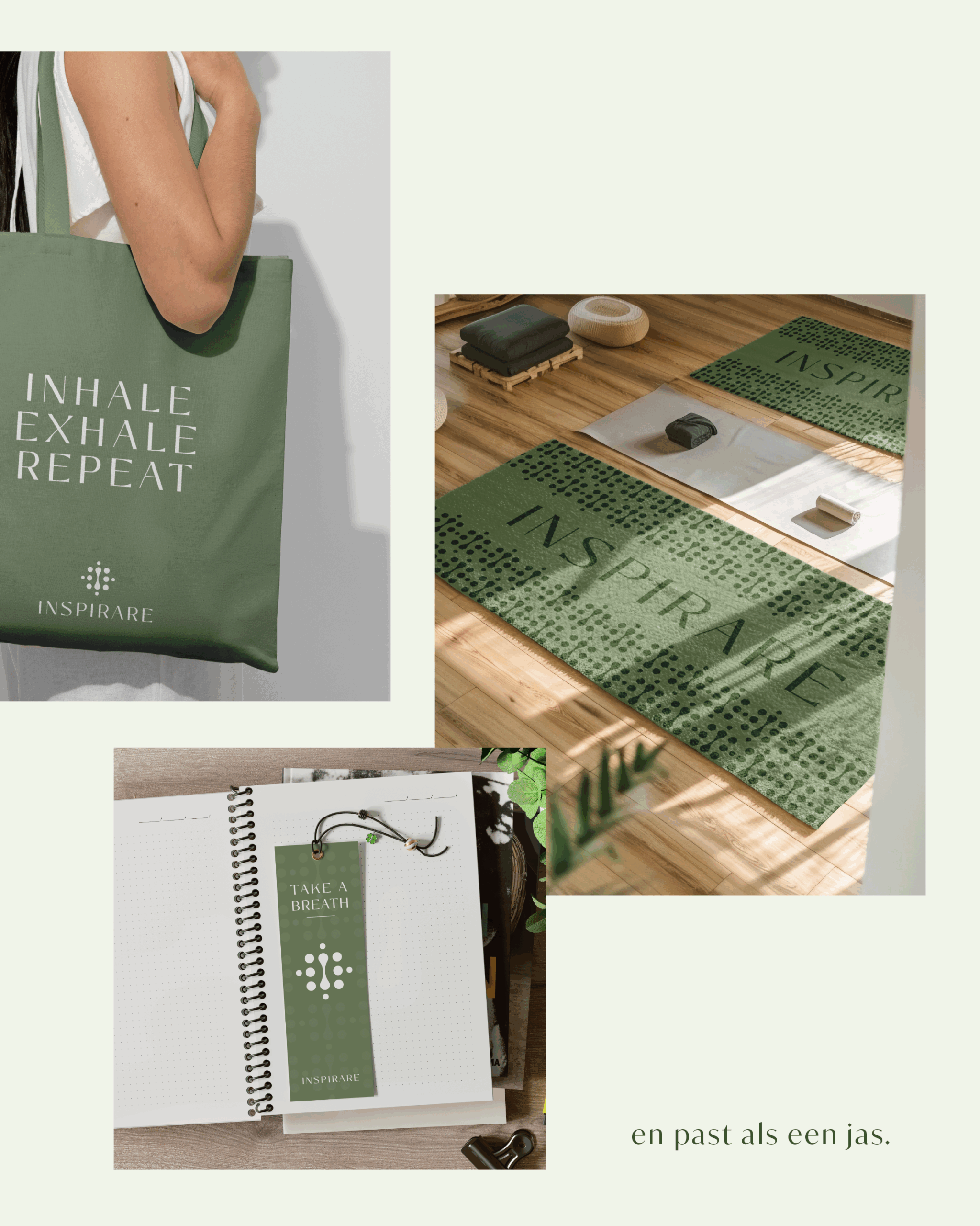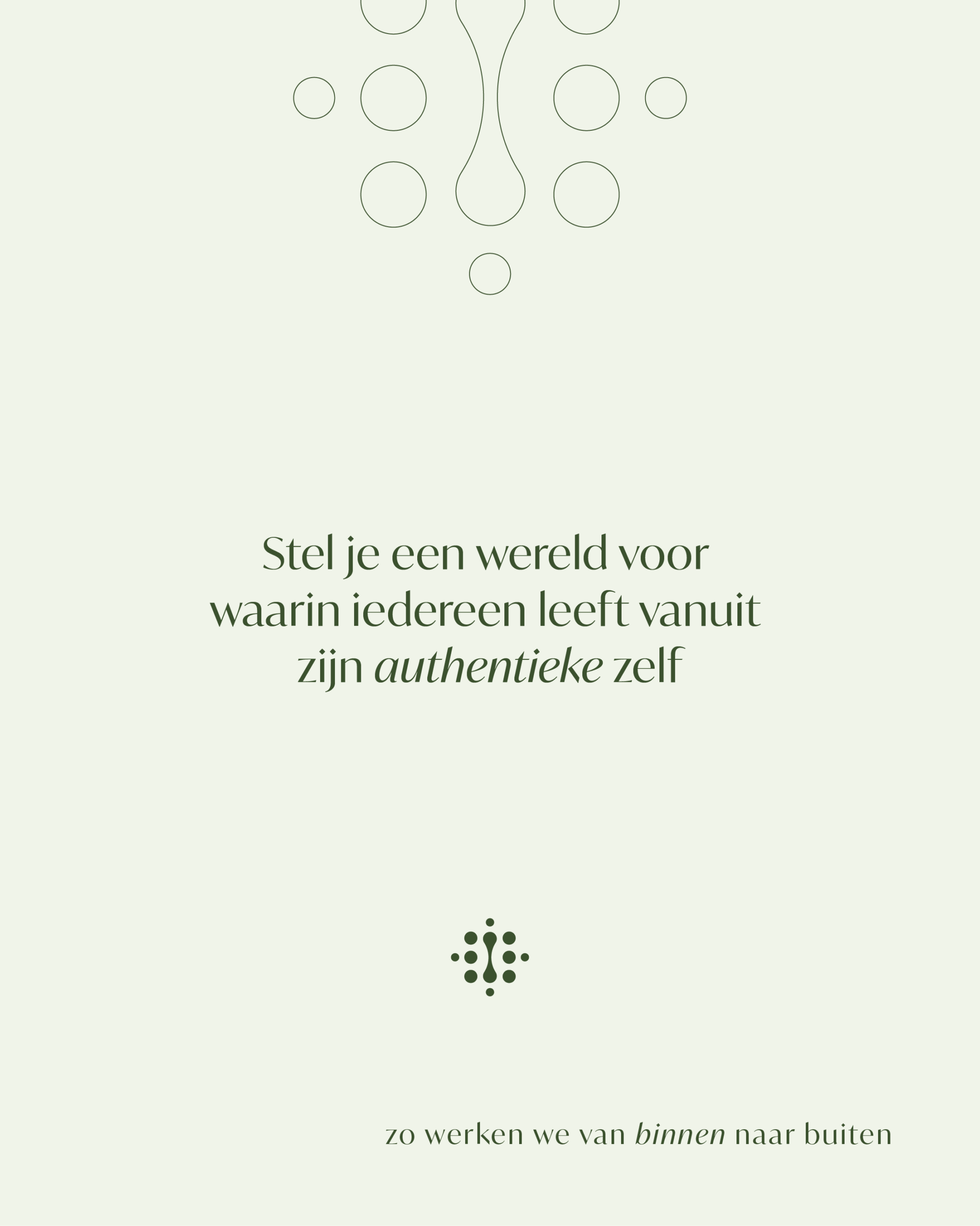 De visuele identiteit voelt rustig en dragend. Het logo verbeeldt adem en energie: een kern met subtiele stippen die ruimte en expansie geven, en een verticale beweging die de stroom van de adem volgt.