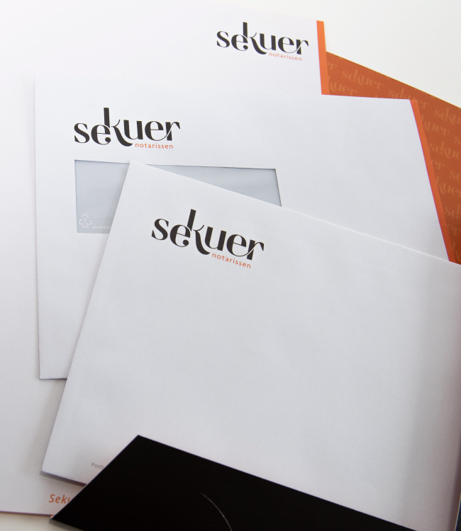 De naam Sekuer is de basis voor het woordmerk. Vanaf de K staan de letters hoger ten opzichte van de eerste twee letters; dat biedt ruimte voor het ‘verstopte’ uitroepteken en het woord notarissen. Het uitroepteken is spot on, naar het uitgesproken karakter van beide dames. Daarnaast onderstreept het de nieuwe slogan: zeker weten!